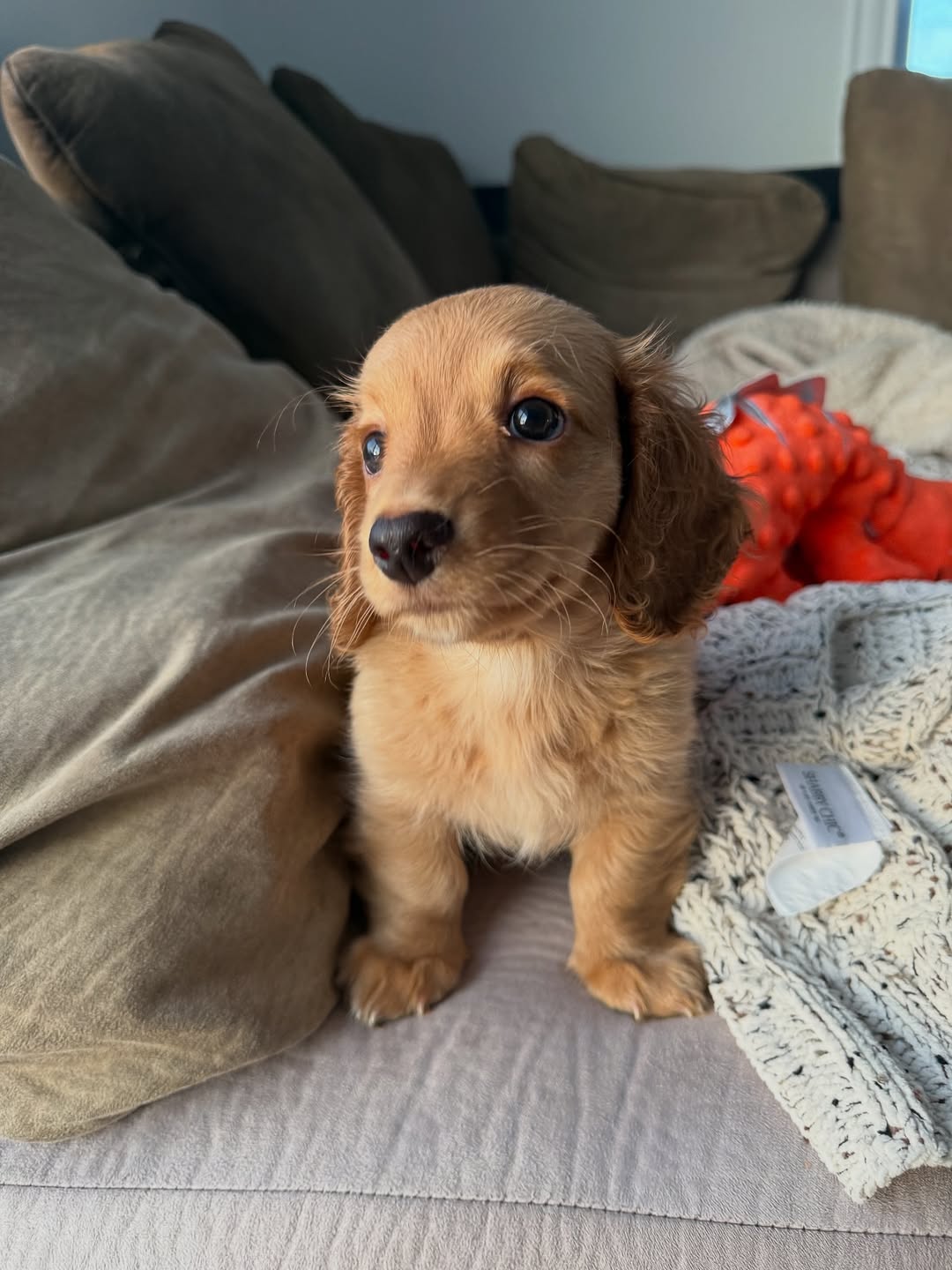 Weslie ist ein hübscher, langhaariger Zwergdackelrüde mit einem satten, schwarz-lohfarbenen Fell, das er von seinen Eltern geerbt hat. Vom ersten Moment an zeigt Weslie eine mutige und neugierige Persönlichkeit. Er liebt es, neue Ecken zu erkunden, Geräuschen nachzugehen und Spielzeug auszuprobieren – und das alles mit einer verspielten Energie, der man einfach nicht widerstehen kann. Trotz seiner Abenteuerlust hat er auch eine sanfte Seite und genießt es, sich nach dem Spielen einzukuscheln.